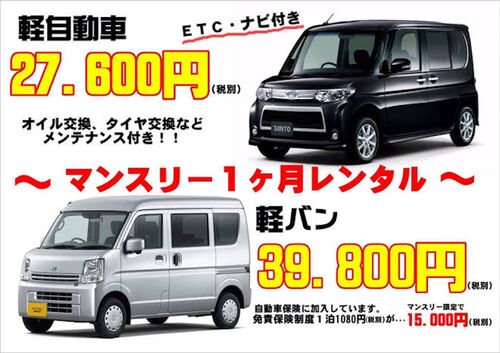 通勤やお買い物、週末のお出かけから送り迎え等お客様のライフスタイルにあった使用用途で大活躍のレンタカー契約となっております。 特に1ヶ月でお車の使用頻度が多いお客様、お仕事等で軽トラックや軽バンの貨物車を定期的に、もしくは長期的にご利用されたいお客様! 通勤やお仕事の関係で県外移動の多いお客様や、県外にお住まいのお客様からも非常に好評となっております! ガソリン代の値上げ含めて、車を所有するとどうしても維持費が高くなってしまうとお考えのお客様には、マンスリーレンタカーが非常にオススメです! マンスリーレンタカーではお車の利用料金・ガソリン代・駐車場代が必要となりますが お車の所有に必要な税金関係や車検費用、定期的な店頭でのお車のメンテナンスに関しては無償で行っておりますので、お客様ご自身でお車を所有されるよりも格段にお安く長期的にご利用いただけます! ⚠️ご契約期間のタイヤパンク等によって発生する修理費用・パネルの損傷・相手の有無問わず事故による営業補償や修理代金はお客様負担となりますのでご了承下さいませ。 ・万が一の事故の際に備えた任意の補償制度をご用意しております。 ・免責補償制度 15000円 (16500円) 事故による対物・車両の保険を使用する際に必ずかかる免責額各5万円の計10万円を補償致します。 ・免責補償制度+自損事故発生時の修理金額の補償制度 45000円 (49500円) 上記の免責補償制度に加えて、自動車保険内容が適用外となるお客様の運転ミスによる自損事故発生時のお車の修理金額も補償致します。 上記2つのプランをお選びいただき、任意でご加入いただけます。 ⚠️ 免責補償制度+自損事故発生時の修理金額の補償制度 こちらは営業補償(ノンオペレーションチャージ)は補償対象外となります。 特に1ヶ月でお車の使用頻度が多いお客様、お仕事等で軽トラックや軽バンの貨物車を定期的に、もしくは長期的にご利用されたいお客様! 「車の使用頻度は多いけど、所有はしていないからその都度レンタカーを借りている…」というお客様がいらっしゃれば、マンスリーレンタカーへの切り替え、ご契約をオススメ致します! 通常のレンタカー利用の場合は「急用でレンタカーを使いたいけど、空いてるかな…」といったご心配や「店頭に行く時間がない…急いでいる…」という状況にも対応可能! まるでお客様のお車かのようにご自由にお好きなタイミングでご利用いただけるので安心! ロードサービスもご契約に含まれていますので、事故やトラブルの際でもご安心いただけます!更に軽自動車、コンパクトカーにはカーナビ・ETCが標準装備! 別途料金がかかる必要も一切ないので、お客様にご負担、ご不便なくご利用いただけるのも魅力となっております! お支払いについても・クレジットカード決済・現金払い・振り込み・PayPayなど さまざまな方法がありたくさんの人にご利用頂きたいので 柔軟な対応をモットーに営業しております。 ※全て先払い制となっております。 走行距離に制限がある事が多いマンスリーレンタカーですが、弊社のマンスリーレンタカーでは走行距離も制限無し! 使用用途によっては距離が伸びるというお客様も多いかとは思いますが、そういった場合でもご安心下さい! 走行距離が多いお客様には1ヶ月に1度店頭にてオイル交換を行います! 定期的なメンテナンスも行なっておりますので、安心して長期的にご利用いただく事が可能となっております。 基本料金に自動車保険・ロードサービスが含まれております! 万が一の事故・故障の際もご安心くださいませ!お店へのご連絡で事故のご対応やレッカーの手配等させて頂きます! 事故や故障が万が一あってもご安心下さい。 全車ロードサービスをご利用頂けますので、代わりの代車をお持ちさせて頂きます! 茨木市N様「利用中に事故に遭ってしまったんですが、詳細を伝えるだけでその後の対応はスタッフさんがしてくれました。補償に入っていたので大きな出費が出る事もなくてよかったです。補償内容も凄く手厚いものだと感じました。代わりの車もすぐ用意してくれてスタッフさんも怪我だったりの心配をしてくれたのが凄く嬉しかったです。」 その際は新しいお車もご用意させて頂きますので、ご安心ください! ※任意の免責補償制度をご用意しております。 万が一の事故の際お客様にご負担いただく金額を補償する内容となっております。 自動車保険と別の内容となりますので、スタッフよりご出発前にご説明させていただきます。 任意の内容となりますのでお客様にご加入されるかお選びいただけます!